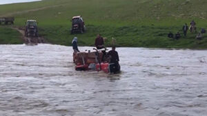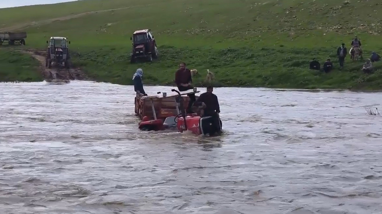 Şanlıurfa’nın Ceylanpınar ilçesinde etkili olan sağanak yağış sonrasında debisi artan bir dere, üç kişinin traktörle geçiş yaparken...