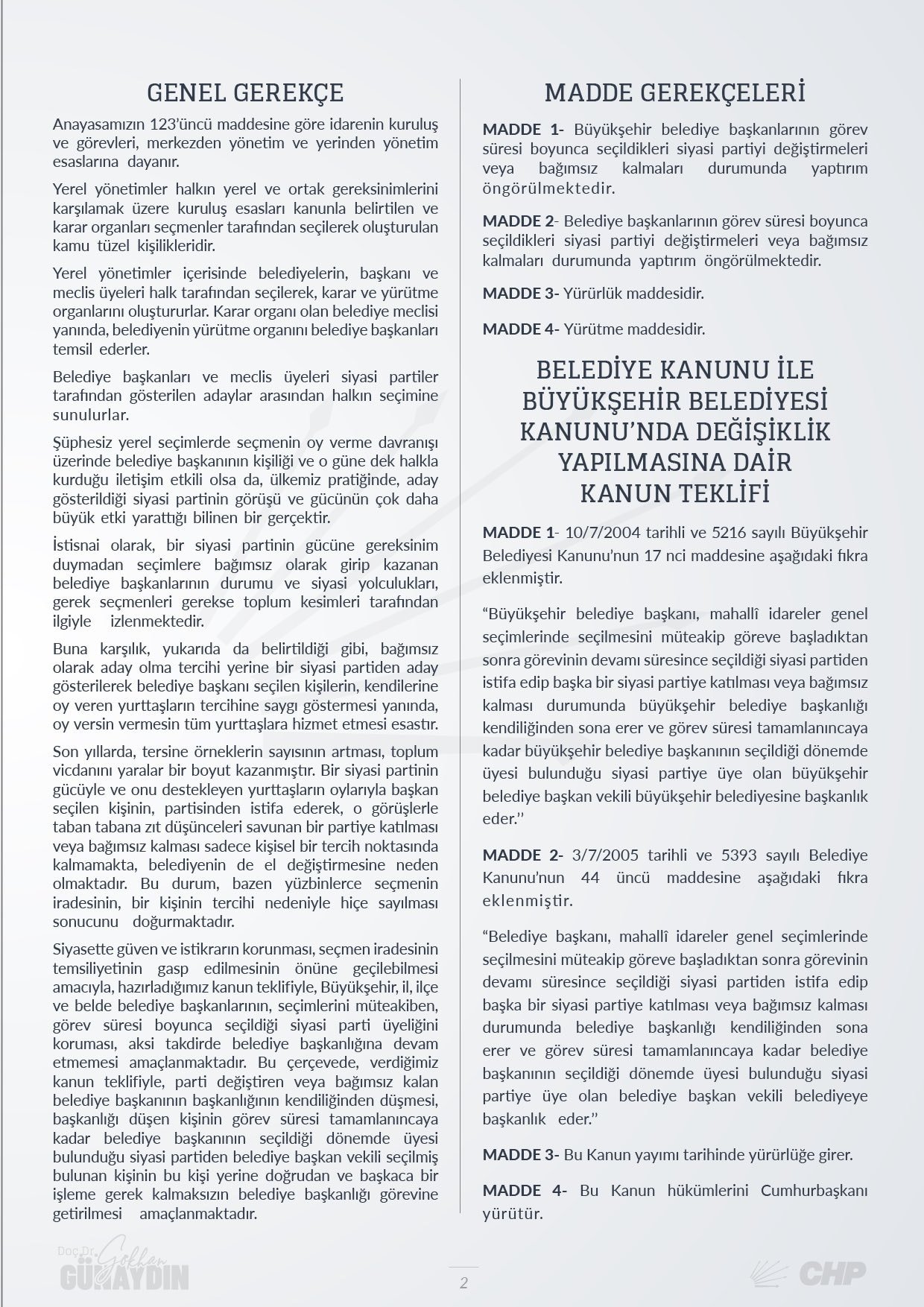 Teklifi Meclis’e sunan CHP’li Günaydın, “Son zamanlarda sıkça rastlanan ve hepimizin kızgınlığını ve zaman zaman öfkesini alan bir uygulama var. Belediye başkanları seçildikten sonra partilerinden istifa ediyorlar ve parti değiştiriyorlar. Böylece sadece kendi iradeleri değişmiyor, onlara oy veren on binlerce, yüz binlerce iradesini de bir başka siyasal parti lehine değiştirmiş oluyorlar. Eğer gücün varsa bağımsız aday ol ve böylece belediye başkanı seçil. Sana oy veren partinin ve seçmeninin iradesini alıyorsan onu muhafaza etmek zorundasın. Başka partiye taşıyarak adeta iradeyi çalma pozisyonuna düşmemen lazım.” dedi.