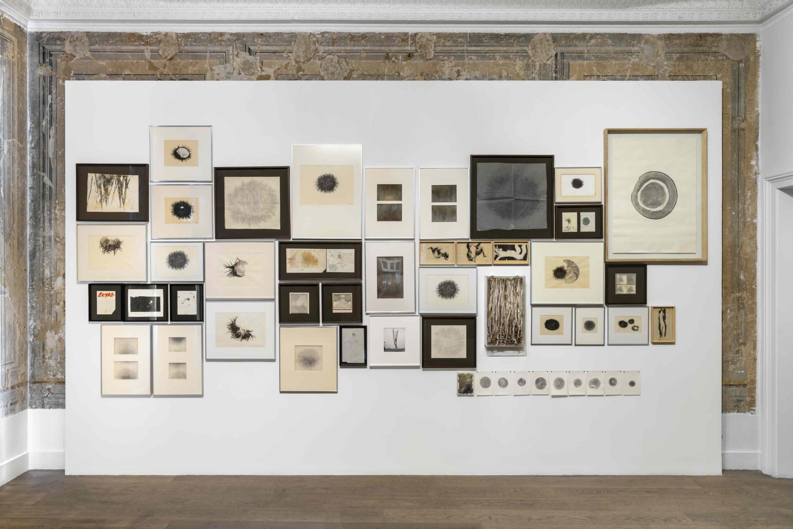 Serginin atmosferi, izleyicileri Kurtiç’in dünyasına davet eden Elif Uras’ın Tepeler adlı eser serisiyle başlıyor. Uras’ın seramikten, sıraltı boya ve altın yaldız içeren 11 parçalık soyut çalışmaları, serginin görsel algısını belirleyen bir köprü işlevi görüyor. Bu görsel topluluk, ruhu yoğun bir iyot hissiyle saran bir atmosfer yaratırken, Kurtiç’e de zarif bir selam niteliği taşıyor. Bunu takiben, izleyiciyi karşılayan tarihsiz bir Kurtiç soyutlaması bulunmakta. Sanatçının yarı şeffaf resmi, deniz kestanelerine adanmış ilk güzelleme olarak, kâğıdın üstünde henüz taze ve ıslak bir iz bırakıyor. Kahverengi, sarı, mavi ve beyazın bir araya geldiği bu çalışma, küçük ile büyük arasında baş döndürücü bir gerilim yaratarak, serginin bütününe dair güçlü bir görsel anlatım sunuyor.