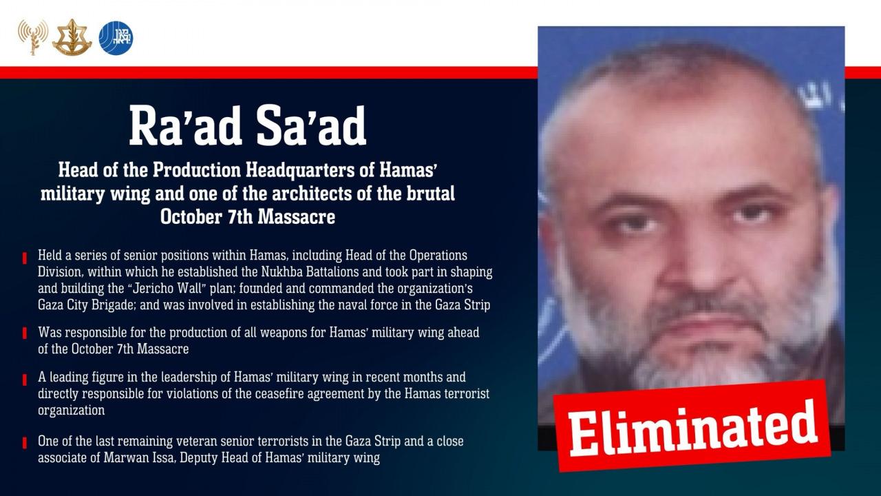 “Raad Saad… Hamas’ın askeri kanadının Üretim Karargahı Başkanı ve 7 Ekim Katliamı’nın acımasız mimarlarından biri.