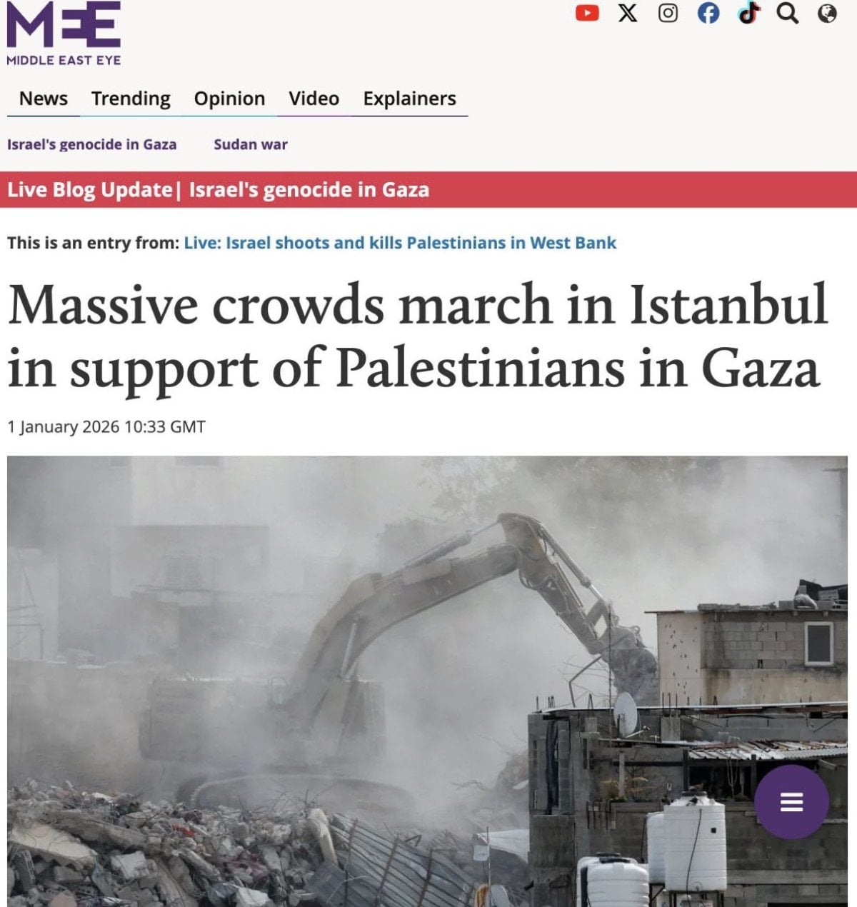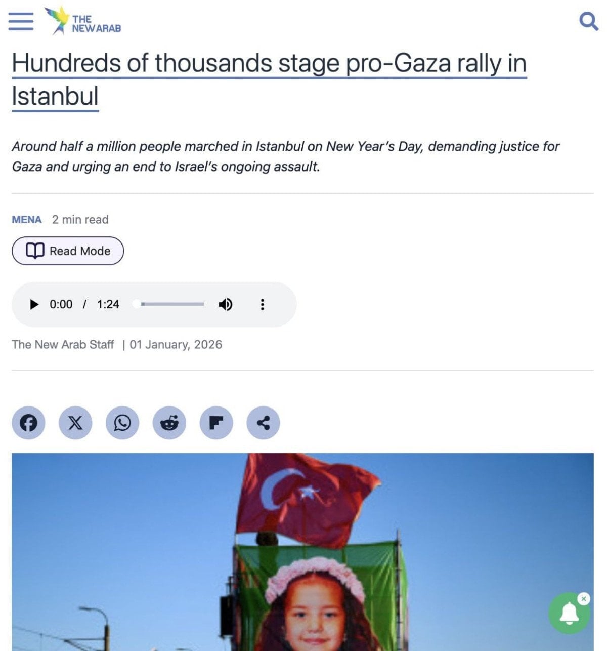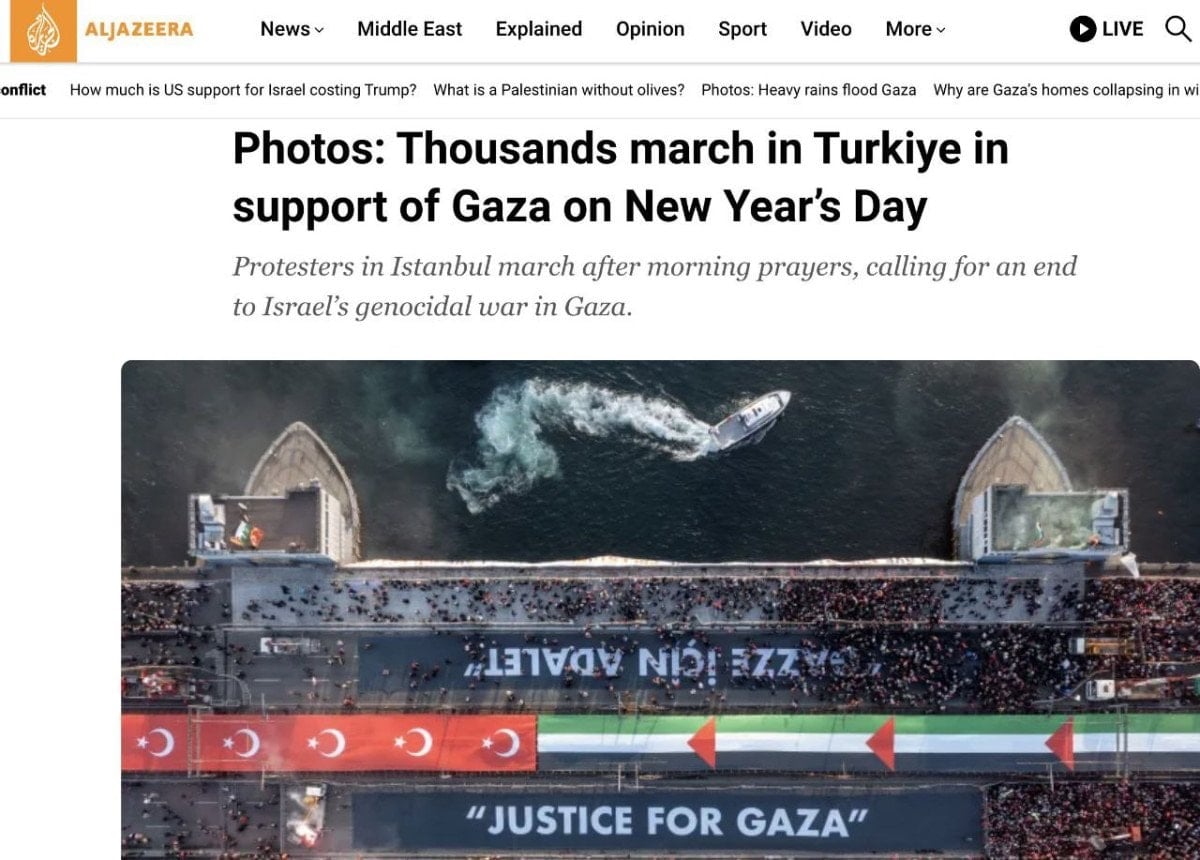 The New Arab gazetesi, İstanbul’da, yılın ilk gününde büyük bir kalabalığın Gazze için adalet talep ettiğini ve İsrail’e karşı çıkışını yaptığını belirtti.