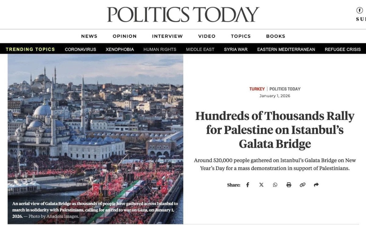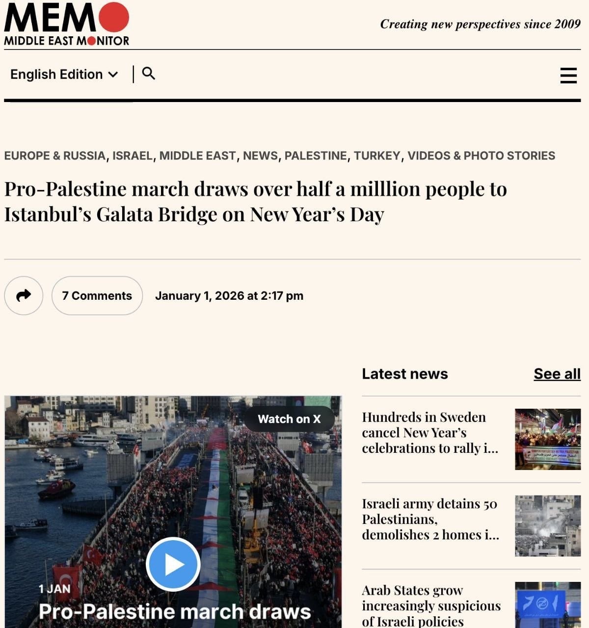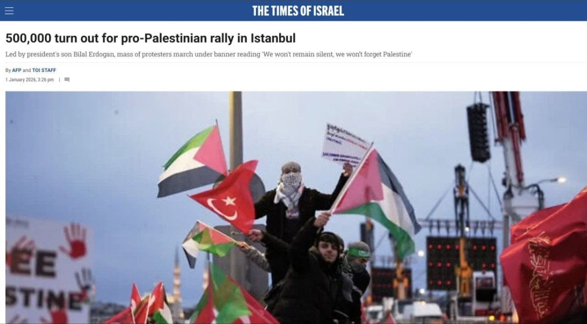 The New Arab gazetesi, İstanbul’da, yılın ilk gününde büyük bir kalabalığın Gazze için adalet talep ettiğini ve İsrail’e karşı çıkışını yaptığını belirtti.