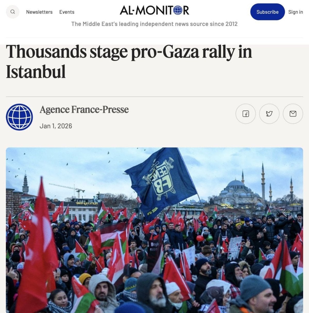 Al Monitor haberine göre, binlerce kişi, Filistin ve Türk bayraklarıyla şiddetin durmasını talep ederek bir araya geldi. Türkiye’nin Gazze’deki rolü de öne çıkarıldı.
