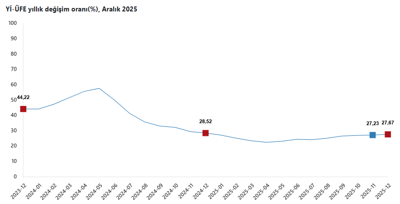2025 yılı Aralık ayında Yİ-ÜFE (2003=100) verilerine göre, bir önceki aya göre %0,75 artış, bir önceki yılın Aralık ayına göre %27,67 artış, bir önceki yılın aynı ayına göre %27,67 artış ve on iki aylık ortalamalara göre %25,36 artış gözlendi.